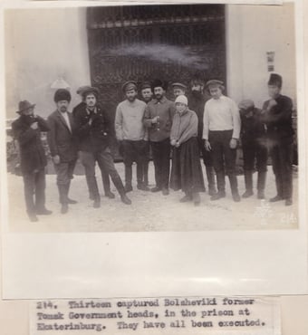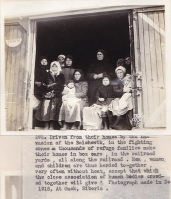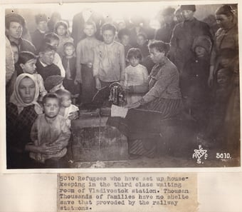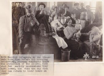 Left above: Photograph No. 5010. “Refugees who have set up house-keeping in the third class waiting room of Vladivostok station. Thousands of families have no shelter save that provided by the railway stations.” Right above: Photograph No. 5012. Russian refugees, by the thousands have fled before the ravaging Bolshevik, seeking sanctuary under the protection of the allies. With what few earthy possessions they have saved, the wait the day when they can return to their home in peace.” Left below: Photograph No.292. Driven from their homes by the invasion of the Bolshevik, in the fighting zones. Thousands of refuge families male their homes in box cars in the railroad yards all along the railroads. Men, women and children are thus herded together, very often without heat, except that which the close association of human bodies crowded together will give. Photograph made in Dec. 1918 at Omsk, Siberia.” Right below: Photograph No. 214. “Thirteen captures Bolshevik former Tomsk Government heads, in the prison at Ekaterinburg. They have all been executed.” Record Group 395: Records of US Army Overseas Operations and Commands, 1898-1942, Entry SE, Box 1 and 2, American Expeditionary Forces in Siberia, National Archives at College Park, MD.