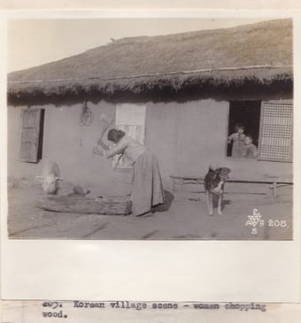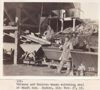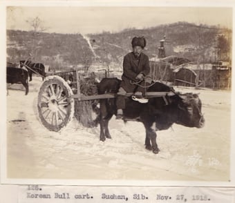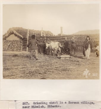 Left above: Photograph No. 115. “Koreans and Russian women screening coal at shaft one. Suchan, Sib. Nov. 27, 18.” Right above: Photograph No. 126. “Korean Bull cart. Suchan, Sib. Nov. 27, 1918.” Left below: Photograph No. 207.”Grinding wheat in a Korean village near Nicolsk, Siberia.” Right below: Photograph No.205. “Korean Village scene. Woman chopping food.” Record Group 395: Records of US Army Overseas Operations and Commands, 1898-1942, Entry SE, Box 1, American Expeditionary Forces in Siberia, National Archives at College Park, MD.
