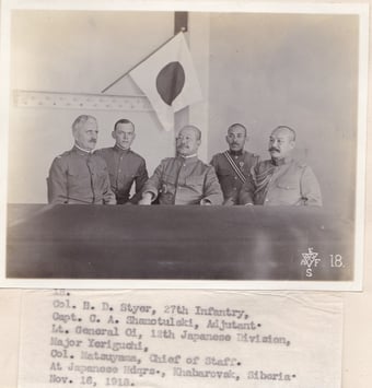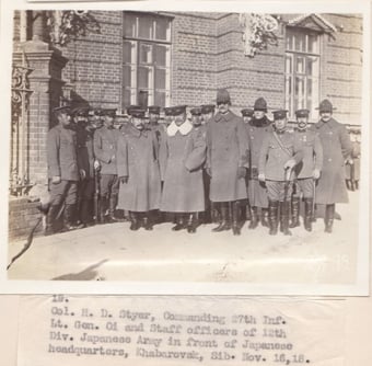 Left: Photograph No. 18. “Col. H.D. Styer, 27th Infantry, Capt. C.A. Shamotulaki, Adjutant. Lt. General Oi, 12th Japanese Division, Major Yoriguchi, Col. Matsuyama, Chief of Staff at Japanese Hdqrs, Khabarovsk, Siberia, Nov. 16, 18.” Right: Photograph No. 19. “Col. H.D. Styer, Commanding 27th Inf., Lt. Gen. Oi and staff officers of 12th Div. Japanese Army in front of Japanese headquarters, Khabarovsk, Sib. Nov. 16, 18.” Record Group 395: Records of US Army Overseas Operations and Commands, 1898-1942, Entry SE, Box 2, American Expeditionary Forces in Siberia, National Archives at College Park, MD.