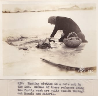 Left above: Photograph No. 236. “Russian soldiers grouped around a fire. These fires are essential for very often the temperature reaches 49 degrees below.” Right above: Photograph No. 237. “Merchants in the streets of Ekaterinburg also build fires to combat the cold.” Left below: Photograph No. 88. “Merchants in the streets of Ekaterinburg also build fires to combat the cold. “ Right below: Photograph No. 230. “Washing clothes in a hole cut in the ice. Scenes of these refugees doing the family wash are quite common throughout Russia and Siberia.” Record Group 395: Records of US Army Overseas Operations and Commands, 1898-1942, Entry SE, Box 1, American Expeditionary Forces in Siberia, National Archives at College Park, MD.
