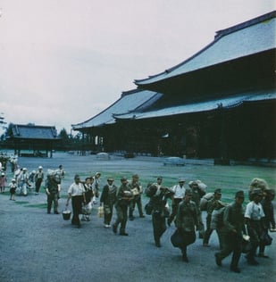 Left: No. C-FEC-5784 “A group of Japanese repatriates from Siberia, accompanied by their families, pass near the Higashi Honganji Temple en route to their homes. Kyoto, Japan. July 20 1948.” RG 111CPF Records of the Chief Signal Officer General Photographic File Color Print File 1944-1954, Box23, National Archives at College Park, MD.