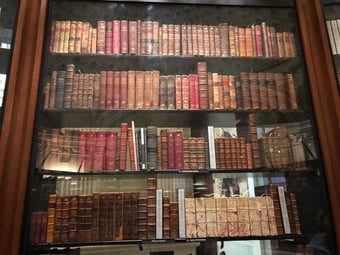 下の写真は、2階奥のギャラリーに展示されているトーマス・ジェファーソン文庫です。1814年に議事堂内に収められていたコレクションの焼失後に、当時すでに退職していたトーマス・ジェファーソン大統領が自らの蔵書の提供を申し出ました。米国議会がジェファーソンの蔵書6,487冊を購入した経緯が今の米議会図書館の基礎として築かれたそうです。