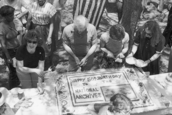 Overhead Shot of National Archives Staff Cutting the Cake during the Picnic Celebrating the National Archives' 50th Anniversary in 1984; Photographs Documenting National Archives Program Activities, Ceremonies, and Observances, 1979 – 1993; RG64 Records of the National Archives and Records Administration, 1789 - ca. 2007; National Archives at College Park, MD [online version available through the Archival Research Catalog (ARC 4477192) at www.archives.gov; April 13, 2020]