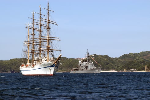 The Japanese tall ship Nippon Maru and a Japan Maritime Self Defense Force (JMSDF) Hatsuyuki class Destroyer HATSUYUKI (DD 122), Escort Flotilla 4 (Yokosuka), 41st Destroyer Division, anchored just outside Shimoda during the 65th Shimoda Black Ship Festival. The Festival commemorates the 150th anniversary of Commodore Matthew Perry's opening of the Japanese port in 1854. Record Group 330: Records of the office of the Secretary of Defense, 1921 – 2008. Series: Combined Military Service Digital Photographic Files, 1982 – 2007; National Archives at College Park, MD [online version available through the Archival Research Catalog (ARC Identifier 6641162) at www.archives.gov; April 22, 2020]