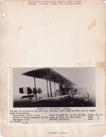 Above left: Caproni Transport. Original too large to be filed in books. Received for Gen. Mitchell’s Office, Jan 1923. Photo No. B622.