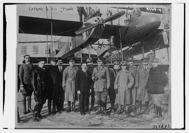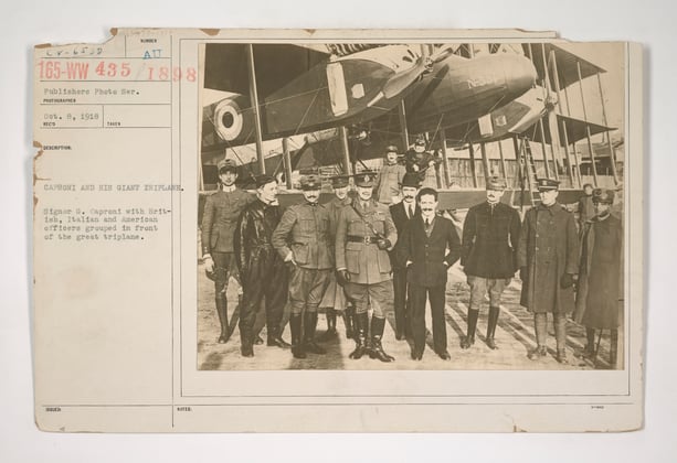 Caproni and his giant triplane: Signor G. Caproni with British, Italian, and American officers grouped in front of the great triplane. No. 65 WW 435-P1898. Received on 10/8/1918. RG 165 Records of the War Department General and Special Staffs, Series: American Unofficial Collection of World War I Photographs, Personnel - P1800 through P1899, Box 435. National Archives, College Park, MD. https://catalog.archives.gov/id/45534078