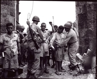 Left: Jap prisoners of war are ”Frisked”by military police following day’s work helping clear debris from buildings destroyed by enemy during battle for Manila, P.I., and just before being marched back to Bilibid Prison to be locked up for the night. Prisoners are Jap soldiers, sailors, and marines and receive fair treatment and standard food. 3/27/1945. No. 310819. Box 644. RG111SC Records of Signal Corps, National Archives in College Park, MD.