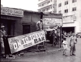 Right: Two workers change the sign over a Manila bar with an appropriate one in keeping with the Japanese surrender. “The Japan Surrender Bar” has changed names with almost each current headline. It was first named ‘The Lingayen Successful Landing Bar and Grill.” Manila, P.I. August 1945. No. 324838. Box 682. RG111SC Records of Signal Corps, National Archives in College Park, MD.