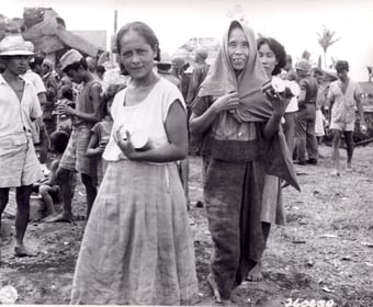 Right: Rations are given to Filipino natives by American troops, Dulag, Leyte Island, Philippines. 10/21/1944. No. 260639. Box 285. RG111SC Records of Signal Corps, National Archives in College Park, MD.