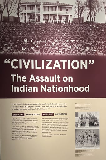 こうした急激な変化の背景には、19世紀初めから20世紀初頭まで続いていた米国の、先住民族に対する文化同化政策もありました。この政策は、それまでの彼らの伝統的な生活様式や、資源だけでなく、言語、宗教、教育や土地制度などを、強制的に変えるもので、子ども達は強制的に寄宿舎学校に入れられたり、先住民族の住む場所を居留地にとどめるなど、「文明化」の名のもとに、先住民族のアイデンティティを根こそぎ破壊するようなものであったと言われています。