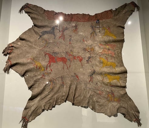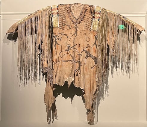 4階の展示の最初は、先住民族の過去から現在までの自由なアート・ワークでした。下の2枚の写真は、1840年頃のミズーリ州の先住民族男性の服の表と裏です。鹿皮、馬の毛、ヤマアラシのトゲ、人間の髪の毛、ビーズや顔料などを使った服で、当時の様々な戦いの様子が描かれています。表は敵からライフルを奪い、自分の部族から尊敬を集めたといったことが、また裏は、ホワイト・スワン(White Swan)という戦士がライフルやピストルを持った敵と闘い、双方が傷つきながらも、彼が敵を倒したという様子が 描かれています。